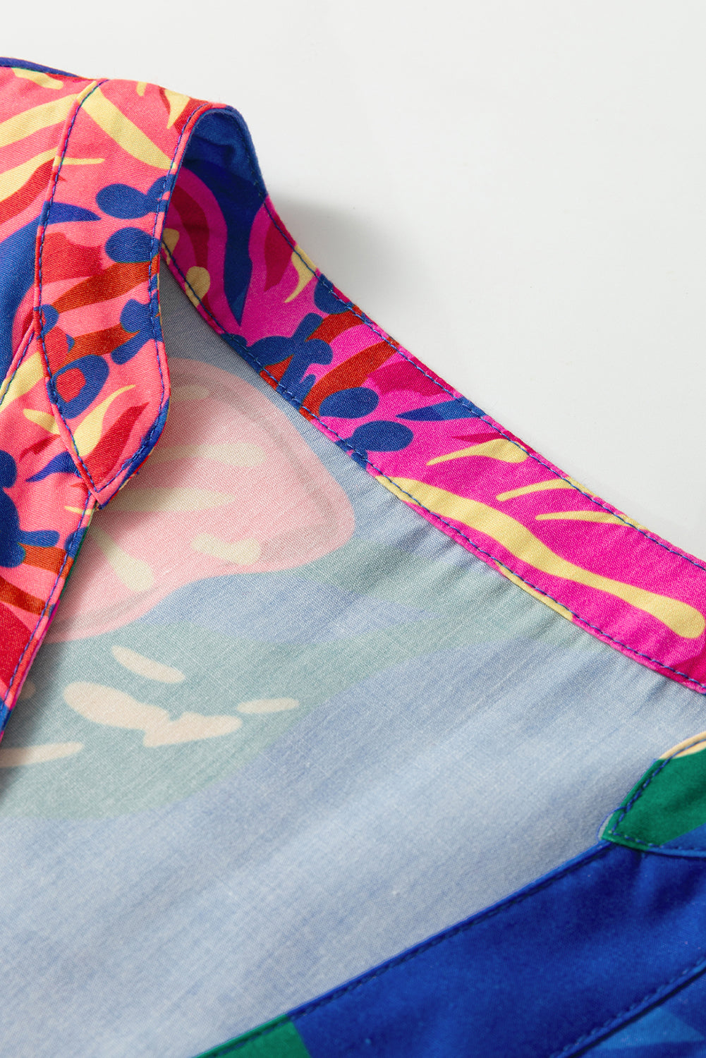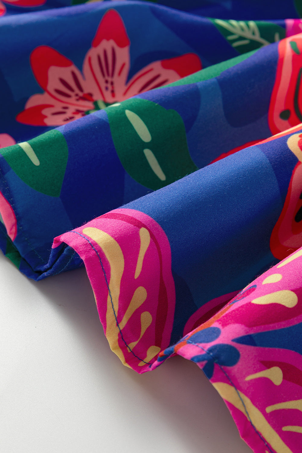 Blue Floral Print 3/4 Sleeve V Neck Tiered Long Dress