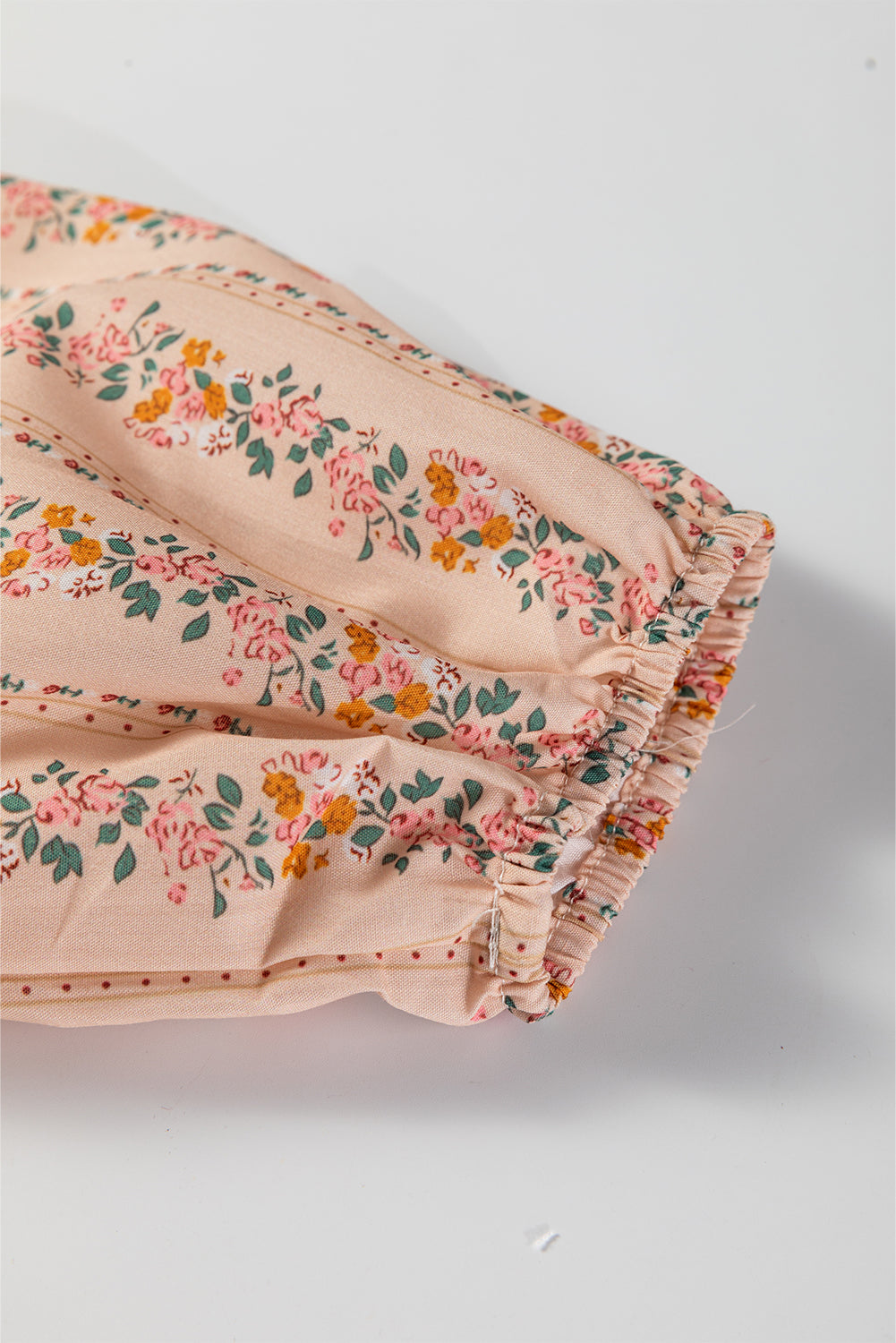 Khaki Floral Print Contrast Velvet Bow Lace Patchwork Long Sleeve Loose Mini Dress