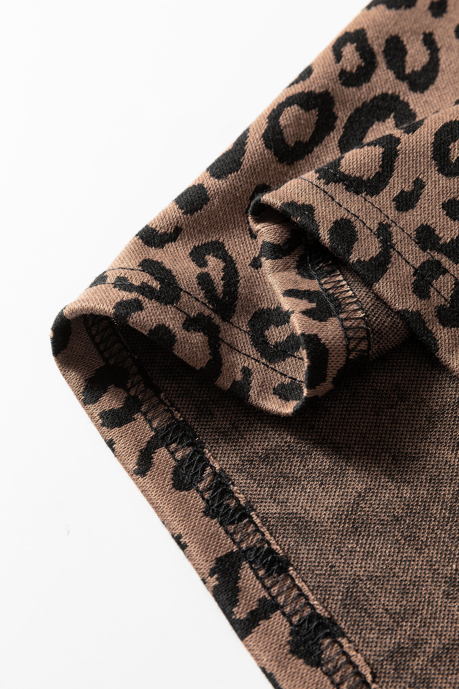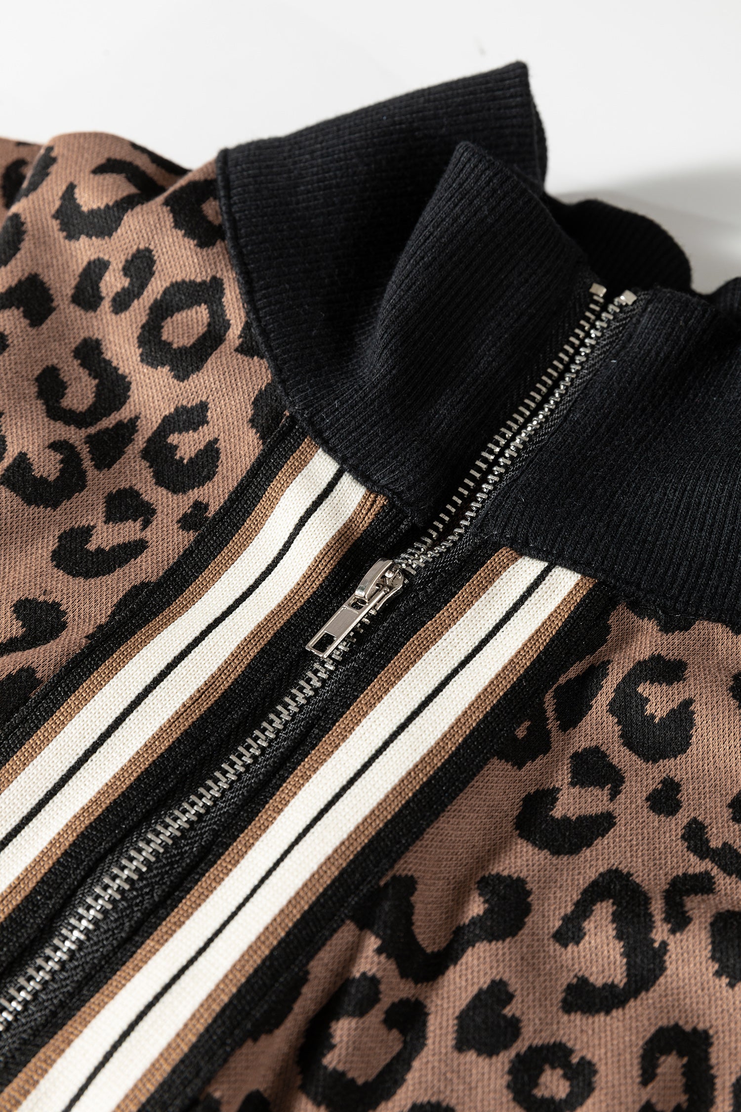 Khaki Leopard Print Quarter Zip Long Sleeve Top Mini Skirt Set